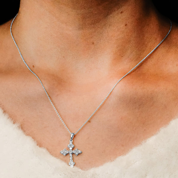 This precious and exclusively available Trinity cross has an elegant Trefoil design and is produced in 100% genuine 925 Sterling Silver. This item is made with 100% genuine Cubic Zirconia for an enhanced luminous quality and style.