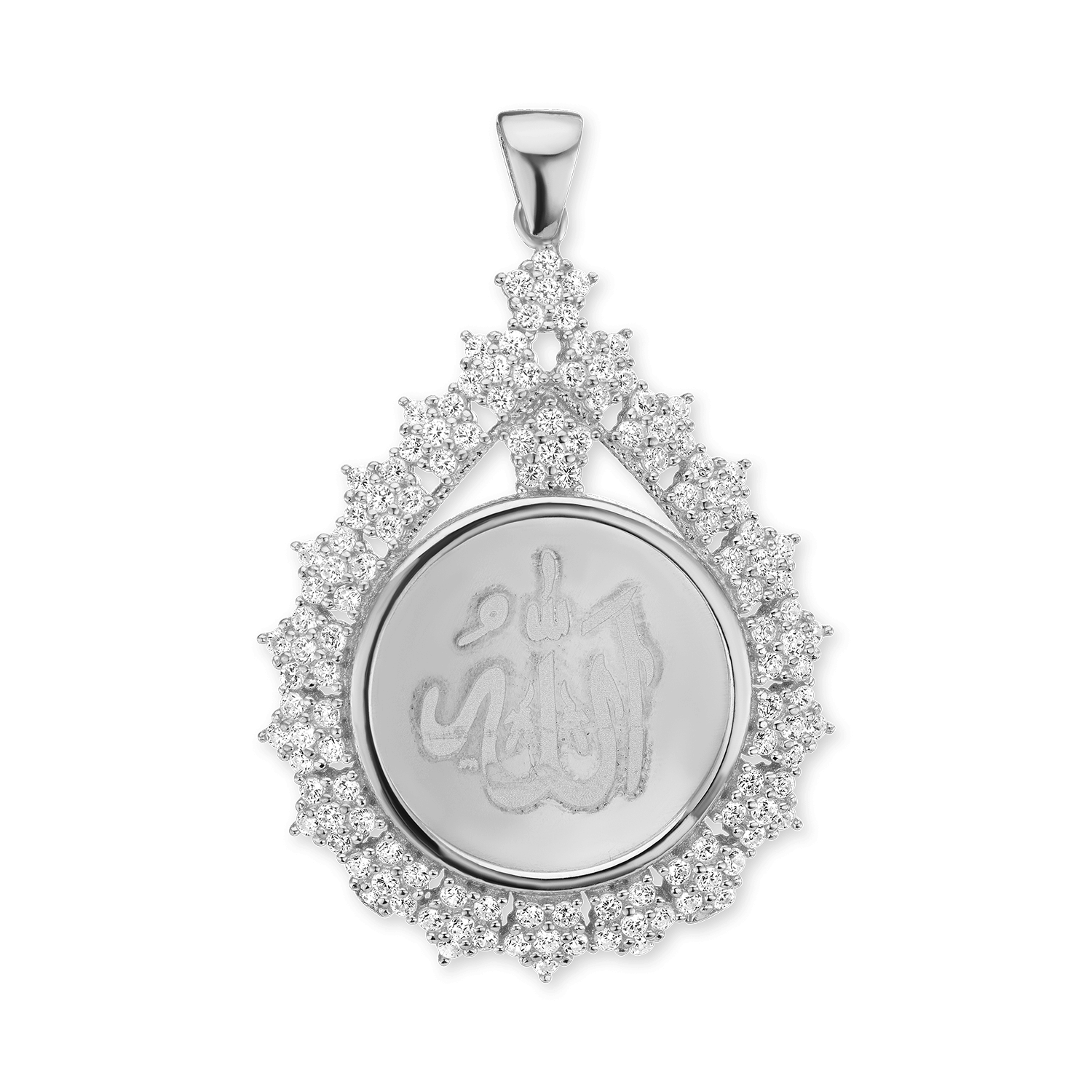 This precious and exclusively available Allah pendant has an elegant framed circle design, exquisitely detailed and accented with sparkling Cubic Zirconia. This item is produced in 100% genuine 925 Sterling Silver to ensure its lasting quality and beauty.