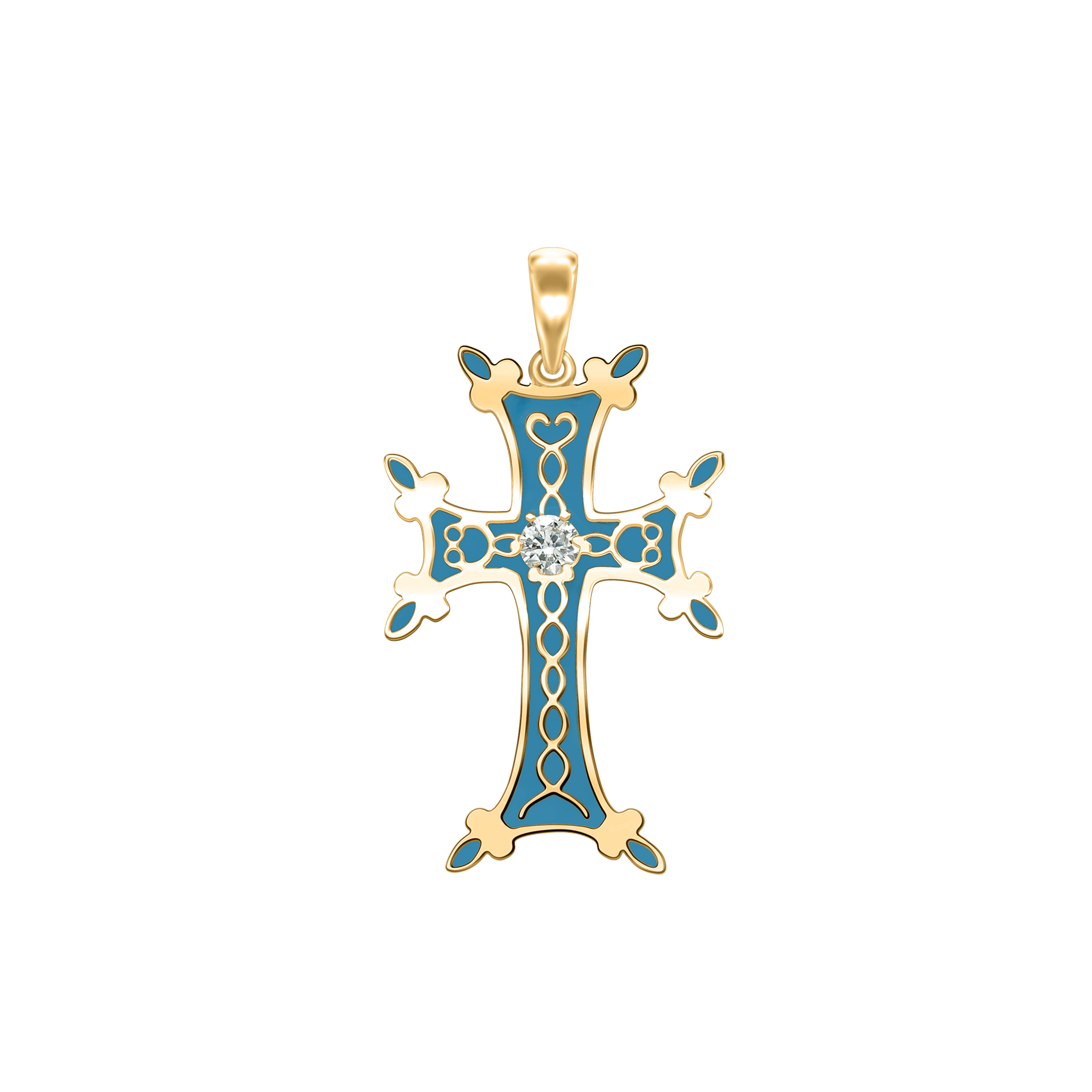 This precious and exclusively available Armenian cross is produced in 100% genuine 925 Sterling Silver and is detailed in rich, luminous light blue enamel with a sparkling Cubic Zirconia accent.