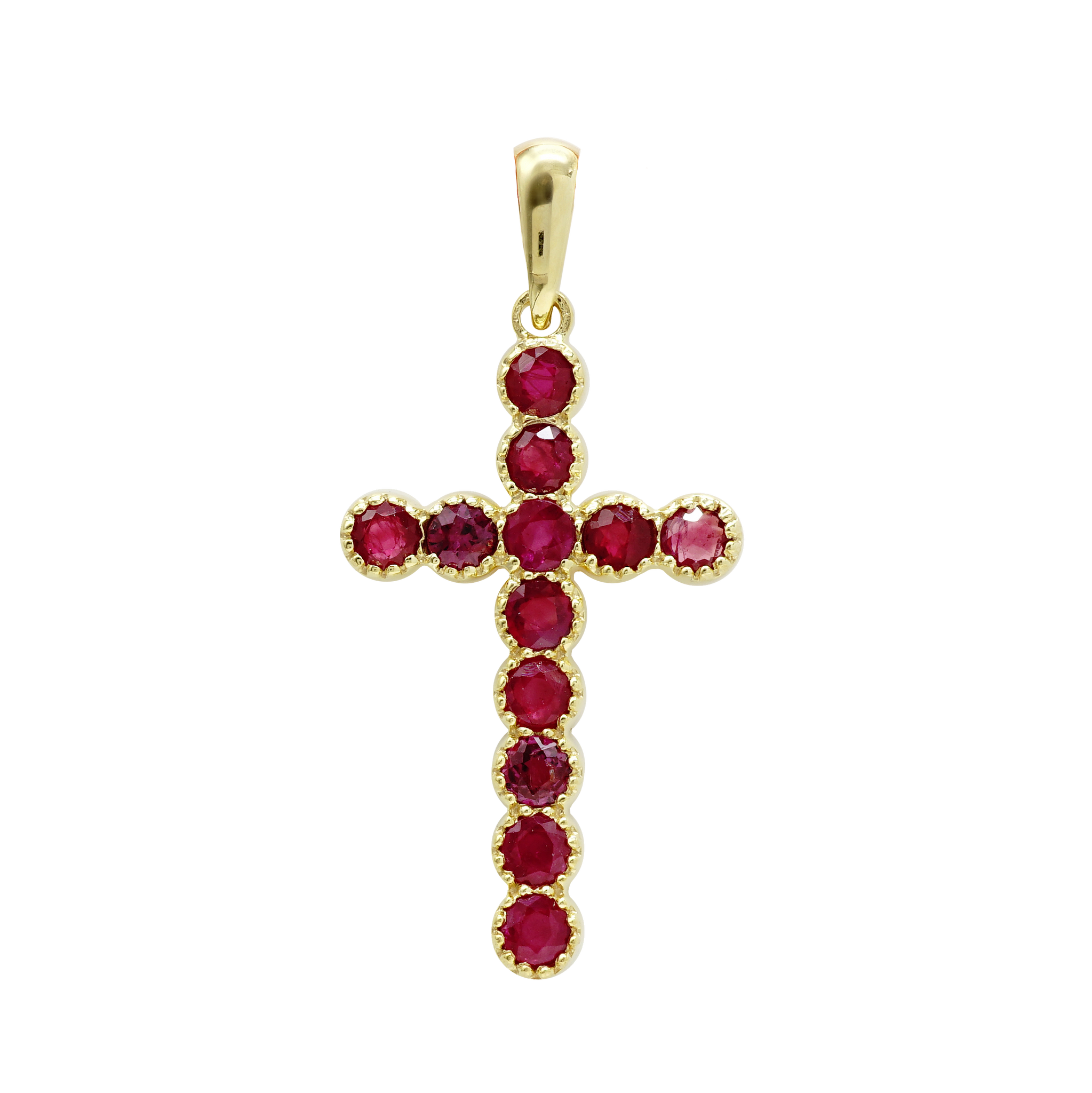 This precious and exclusively available cross has a sparkling bezel set design and is produced in 100% genuine 585 Gold. This item is made with full cut 100% genuine Burmese rubies of 1.75ct (TW) for enhanced beauty and quality.