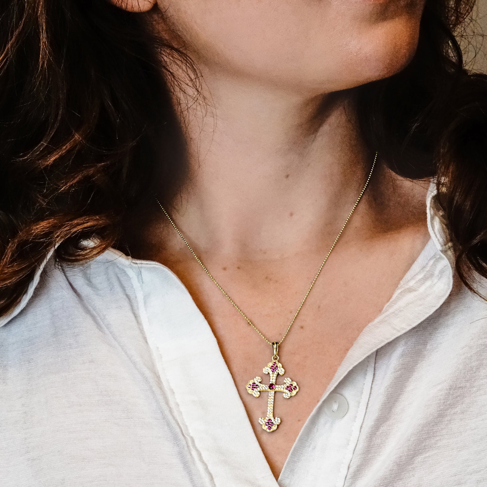 This precious and exclusively available Budded cross has a sparkling design and is produced in 100% genuine 925 Sterling Silver. This item is made with 100% genuine Cubic Zirconia in a vivid rose pink for an elegant color and design.