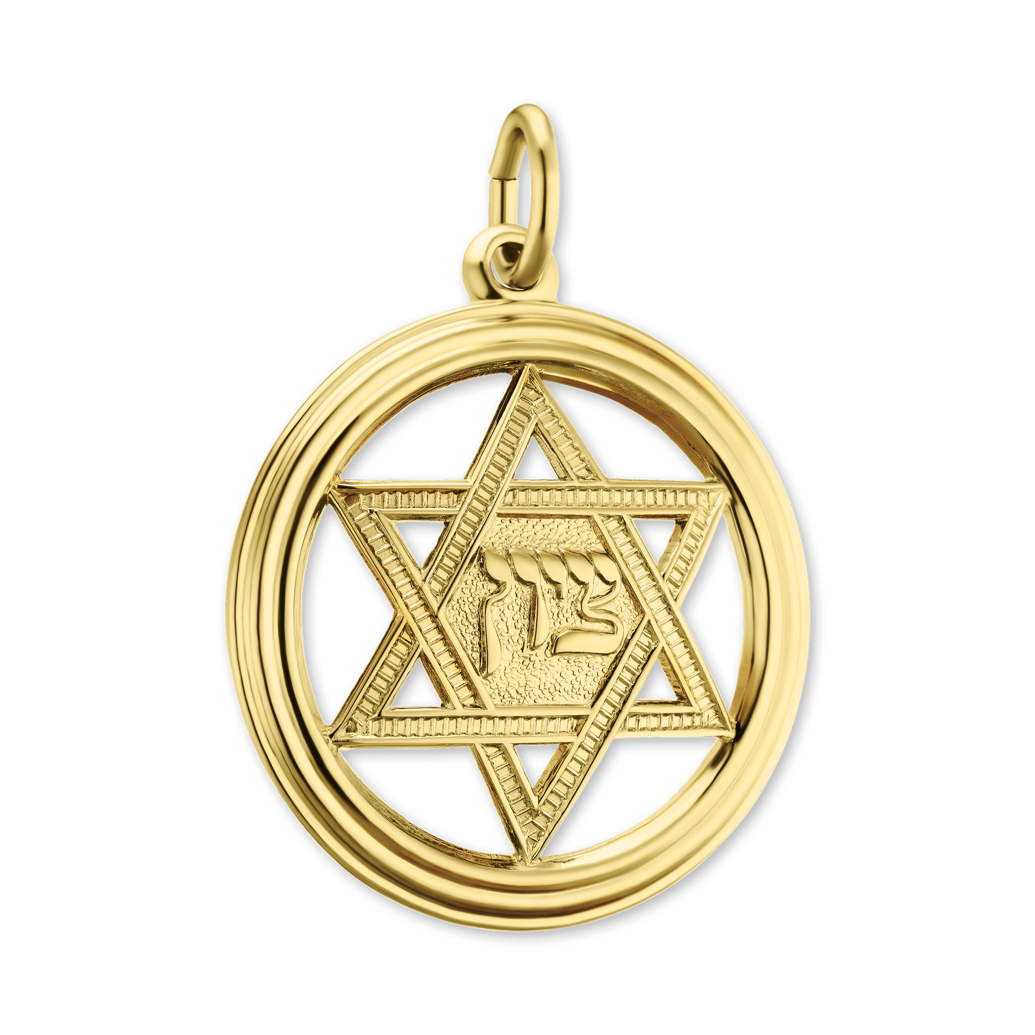 This precious and exclusively available Star of David pendant has a finely detailed circle design and is produced in 100% genuine 585 Gold.